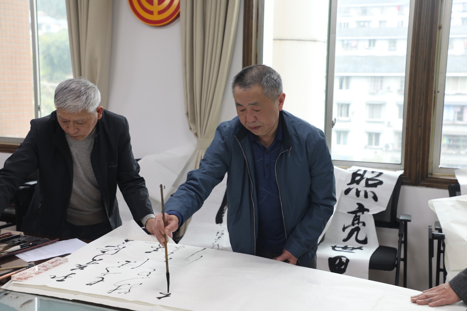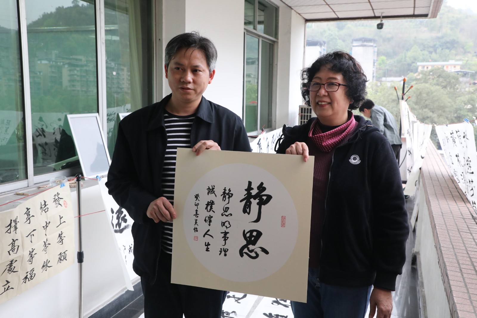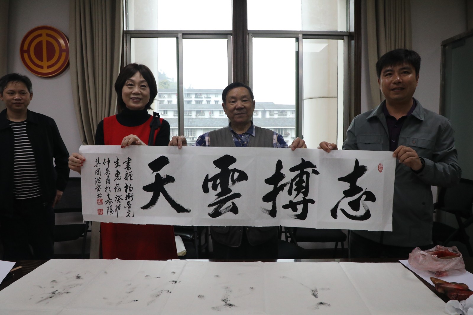 艺术家们饱含激情,挥毫泼墨,将“燃烧自己、照亮世界,奉献自己、服务社会”的嘉阳煤矿燃烧精神跃然纸上;精心勾勒,细致描绘,嘉阳的山水从艺术家们的笔尖淌出;笔走龙蛇,行云流水,为劳模工匠、创新工作室带头人杨卫星、张献云等现场创作,表达对劳模工匠的敬意。张献云激动地说:“谢谢老师们的馈赠,《静思》这幅作品我特别喜欢,它将激励我沉下心来刻苦钻研、积极探索,为智能化矿井建设作出应有的贡献。”