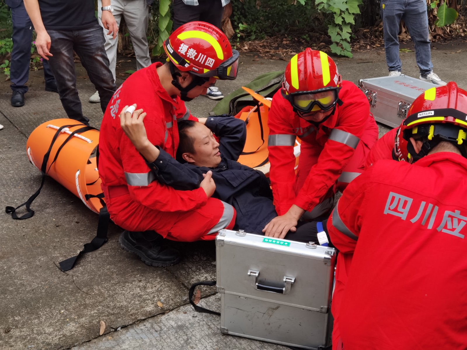 当日8时20许,驾驶员驾车在边远山区时突遇山体滑坡,第一辆车与落石发生剧烈碰撞,导致副驾驶乘客左小臂被异物刺穿,驾驶员利用现场工具不能有效救治乘客。第二辆车因躲避不及碾压一名路人,导致其右腿被压至车底,现场无法处理。驾驶员及时启动公司车辆安全应急处置预案联系办公室值班人员,在办公室的统一指挥下,驾驶员立即对受伤人员进行有效保护,并请求矿山救护队前往事故点开展救援。救护队一支救援小分队火速驾驶救护车奔赴事故点,途中遇道路损坏改为徒步行进。抵达现场确认安全后,队员分两组展开救援,利用破拆工具切割穿刺物,止血包扎伤员受伤的手臂;利用起重设备顶起车辆,救出伤员后确认伤员右小腿开放性骨折,立即对其进行了专业处理。最终,两名伤员被及时送到医院治疗。