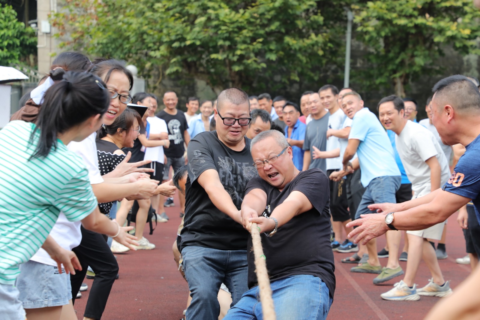 现场参赛男子组12个队,女子组4个队,男子组分4个组比赛,小组第一名出线后进行交叉比赛;女子组采用单循环赛,每场比赛均采用三局二胜赛制。比赛尚未开始,双方就已进入“战斗”状态,双手紧握绳子,双脚用力着地,身体向后微倾,随着一声哨响,队员们都铆足了劲往后拉,憋得满脸通红,反复争夺;落后一局的队员在交换场地后打气鼓劲,使出浑身解数,势在扭转局面。这已不是一场简单的战队实力之间的较量,参赛队员们秉承煤矿“燃烧精神”,通力合作,齐心协力,个个精神抖擞、斗志昂扬,拉拉队员和观众们心潮澎湃,情绪激扬的助威呐喊将拔河比赛推向了高潮。