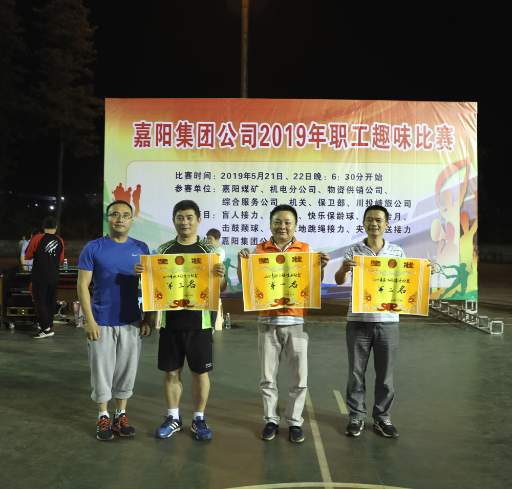 海底传月、钻圈、跳大绳均是14人的集体项目,对各队团队协作能力是一次考验。第一天比赛中盲人接力笑料百出,要求比赛队员戴上趣味眼罩,旁边一人在不触碰比赛队员的情况下指挥他在规定的赛道完成接力挑战,找不到方向走出赛道的大有人在。快乐保龄球要求在规定的距离用气排球滚击矿泉水瓶,将其击倒多者获胜,期间有人一击数瓶也有人擦瓶而过。8个项目既是比赛也是游戏,让人乐在其中,回味无穷。参赛的七支队伍各显神通各有千秋。保卫部在两天的比赛中一举拿下3项第一,锁定冠军,机关获得第二,嘉阳煤矿喜夺季军,集团公司党委书记、董事长杜勤为获奖单位颁奖。