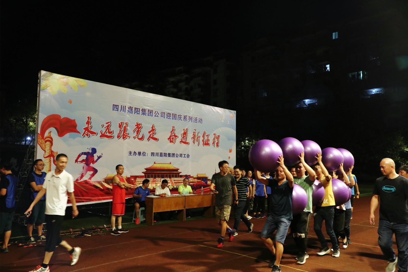19时30分,“迎国庆”趣味项目活动开赛。赛场上,参赛的运动员以饱满的激情、昂扬的斗志、团结向上的精神投入到滚铁环接力、步调一致、螃蟹背西瓜、跳绳接力等趣味项目比赛中,精彩纷呈的竞技项目中掺杂着一个个妙趣横生的小插曲,使得整场活动都充满了叫好声和欢笑声。各项比赛高潮迭起,队员们通力合作,奋勇争先,最终机关队勇夺第一名,嘉阳煤矿、物资供销公司分别获得第二、第三名,公司党委副书记谢建国为获奖队伍颁奖。