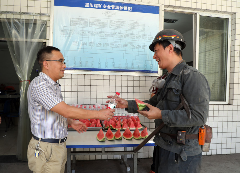 15日下午两点,火辣辣的太阳把地面晒得发烫,一股热浪迎面扑来。党委书记、董事长杜勤率机关第一党支部、第二党支部的党员来到嘉阳煤矿天锡井工业广场,现场给大家加油鼓劲,“大家辛苦了!吃块西瓜凉快凉快,我代表公司、党委感谢大家,向你们表示敬意。”“面对炎热的天气,你们坚守岗位辛勤工作,战高温、斗酷暑,保生产、增效益,为公司生产经营做出了贡献,希望你们保持良好的身体状态,注意安全”。在离矿区十公里处的反斜井堆矸场,杜书记把工人们召集在一块儿坐下来吃西瓜,一边吃一边聊,像兄弟一般亲切地与之谈心,关心大家在这儿的班中餐安排得怎样,并叮嘱大家工作时要注意安全,做好防暑降温。